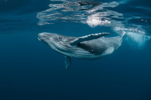A Baby Humpback Whale Plays Near the Surface in Blue Water